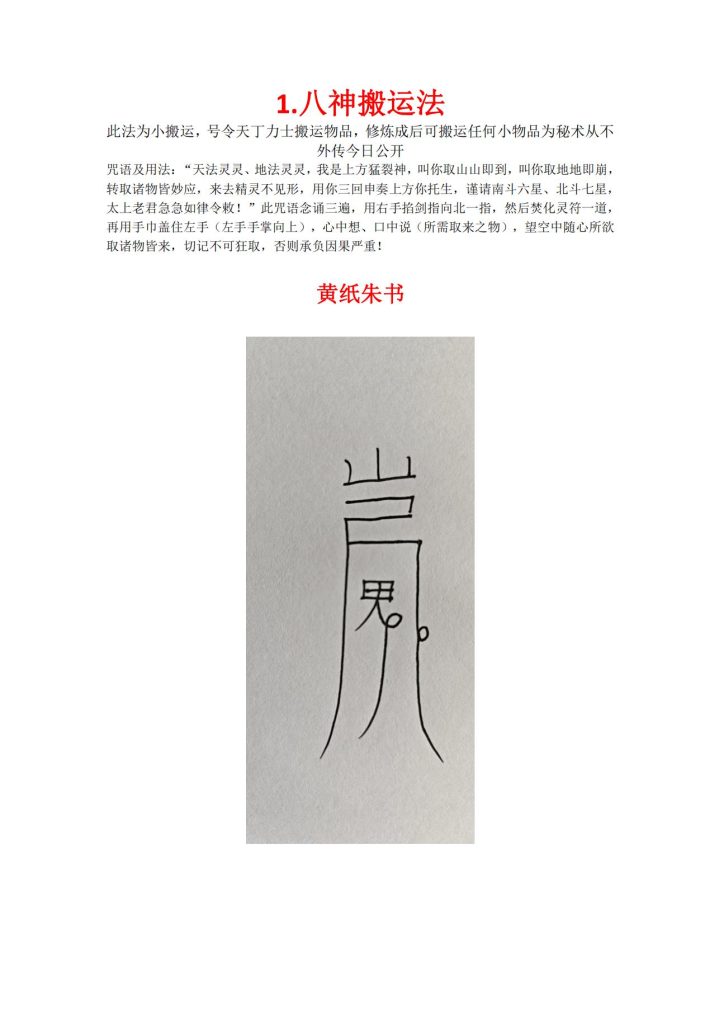 1.八神搬运法此法为小搬运,号令天丁力士搬运物品,修炼成后可搬运任何小物品为秘术从不外传今日公开!
